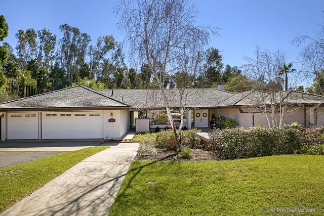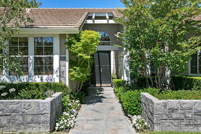 This lovely ranch style home designed for indoor/outdoor entertaining, embodies the casual elegance of Poway living. The inviting slate & brick façade and charming landscaping extend a warm introduction to this expanded Windermere Model home. A grand stone fireplace rises to the ceiling in the living room, separates the space from the family room and provides a backdrop for the custom built-in entertainment center in the family room.