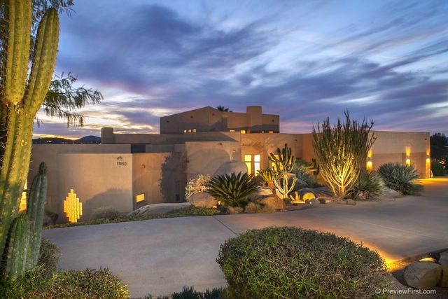 Santa Fe custom home offers stunning architectural detail & expansive mountain/city views perched on top of a quiet Cul-de-Sac. Lives like a single level with family, dining, gourmet kitchen, master & guest suites on 1st floor. Add'l suite, optional BR/office & balcony upstairs. Exquisite craftsmanship, handsome wood beams, soaring 15' ceilings, alder wood cabinets, stainless steel appliances, granite, custom tile work, 8’ interior doors & multiple French doors. ENJOY PRIVACY, VIEWS, NO MONTHLY FEES!