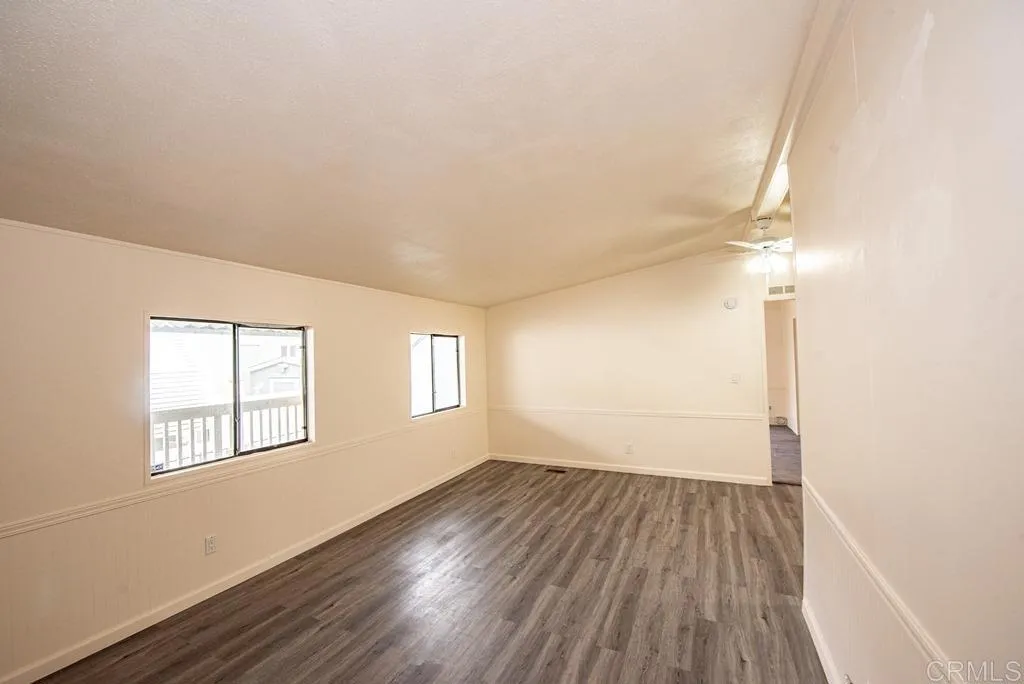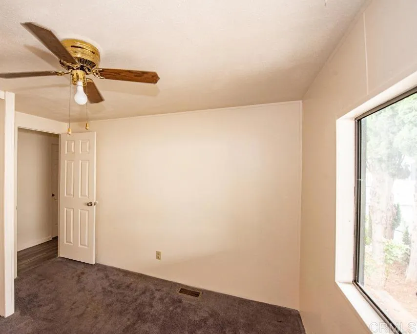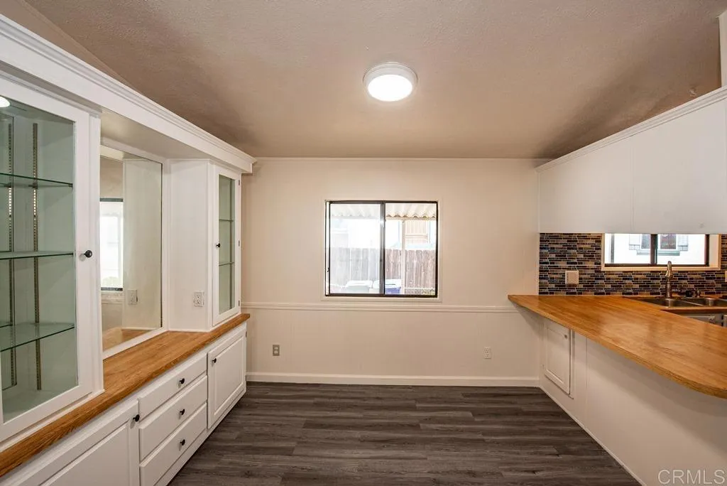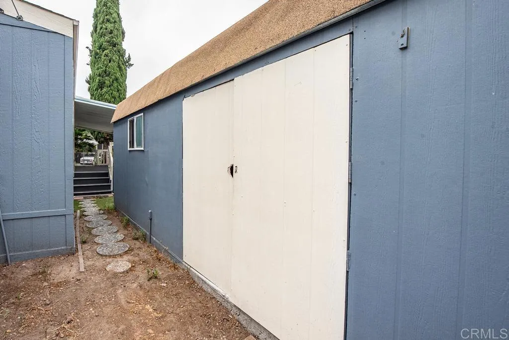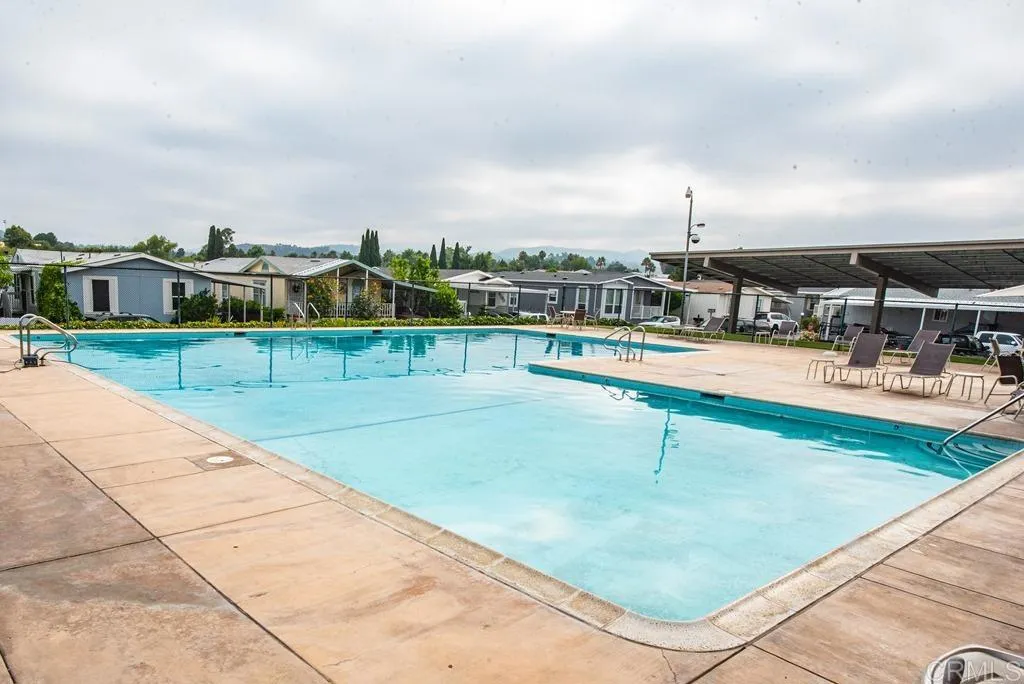 Super Buy! Hard to find 4 bedroom home located in the prestigious Poway school District. Elementary school close by. Freshly painted home inside. Wainscoting decor featured in the living area for that added decorator touch. Neutral colored wood laminate floors throughout living area. Carpeted bedrooms. The kitchen is updated with a sparkling backsplash and stainless steel appliances. Fans throughout the home. Newer water heater. The primary bedroom opens onto quaint patio overlooking the open space behind the home. Another patio is located off the living room for enjoyment. A large 6x20 shed offers lots of extra storage space. The park community offers 2 swimming pools for your enjoyment. Needs some TLC.